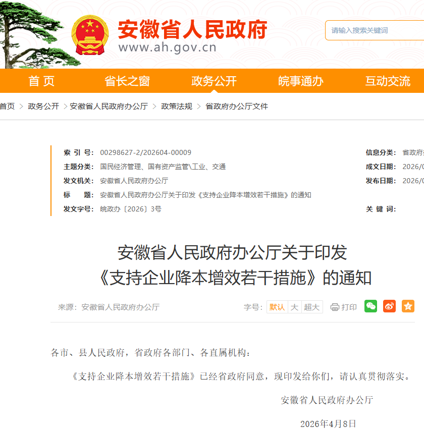 4月24日,安徽省人民政府网站发布“安徽省人民政府办公厅关于印发《支持企业降本增效若干措施》的通知”。具体如下: