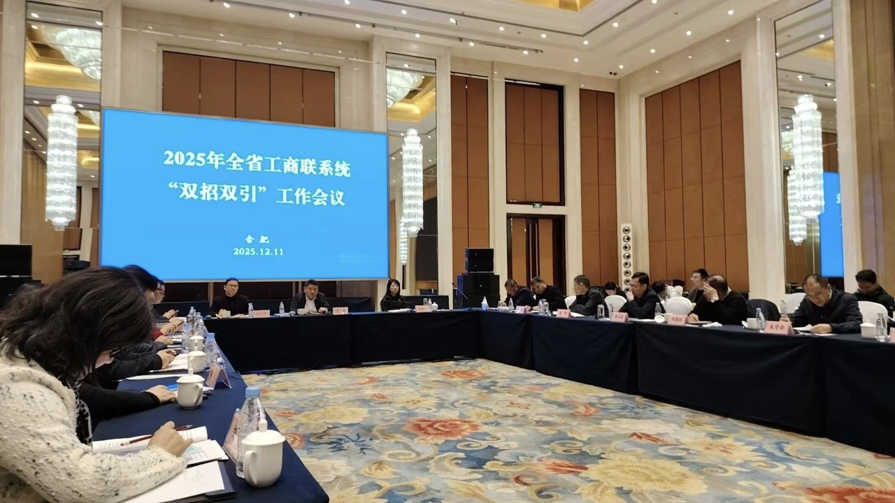 12月11日至12日,2025年全省工商联系统“双招双引”工作会议在合肥召开。省工商联副主席聂磊、安徽国有金融资本投资管理有限公司董事长潘友华出席会议并讲话,省新兴产业推进组、省发展改革委等相关部门负责同志,各市工商联负责人及省联直属商会代表共80余人参会。