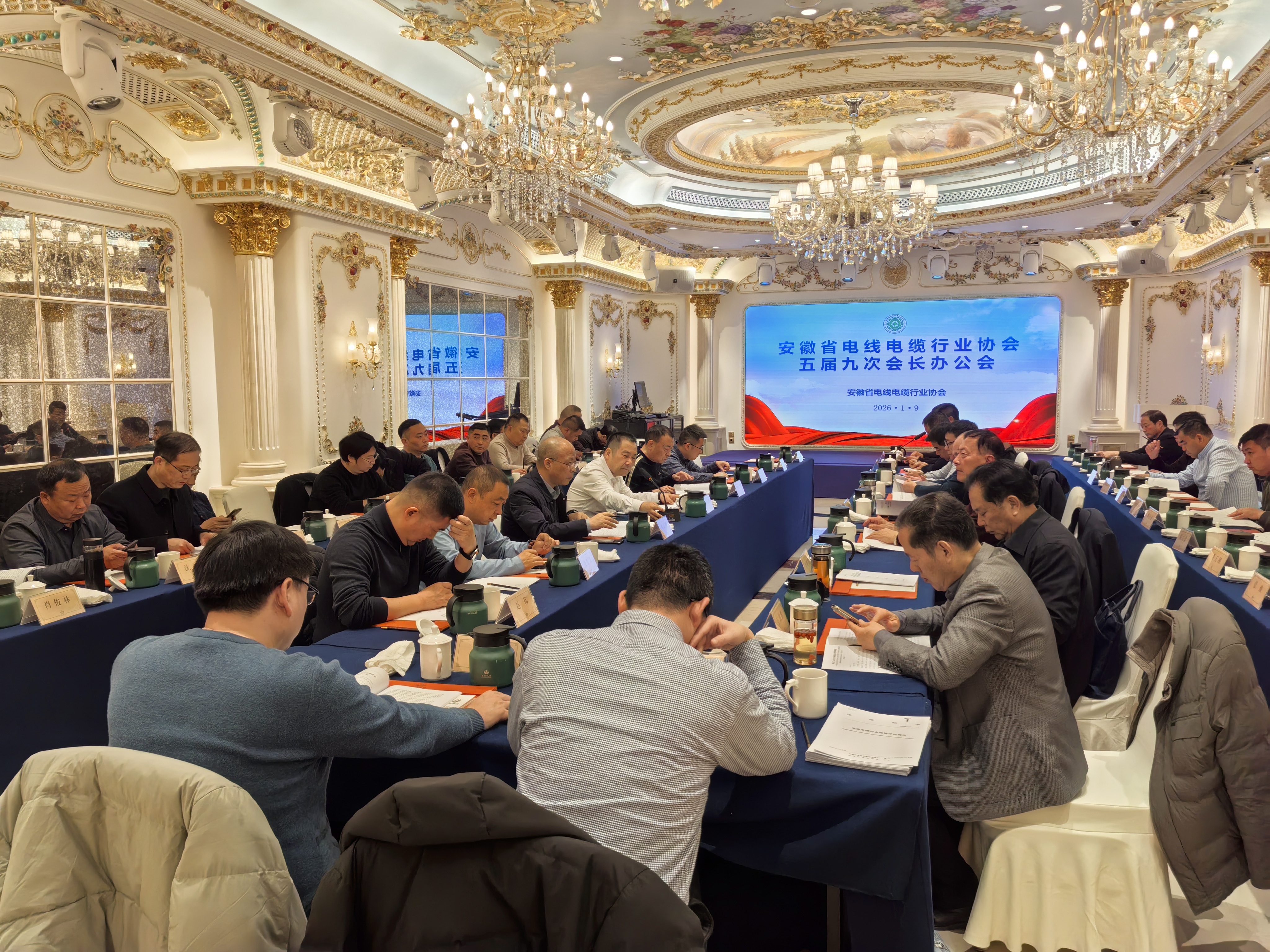 2026年1月9日上午,我会五届九次会长办公会在合肥白金汉爵大酒店召开,旨在立足新发展阶段,统筹推进协会重点工作、凝聚行业发展共识。会长徐顶峰,监事会主席沈文植,党支部书记兼常务副会长王义银,协会执行会长、常务副会长、副会长,以及秘书处相关同志参加会议。会议由常务副会长单位——池州起帆电缆有限公司总经理鲍大章主持。