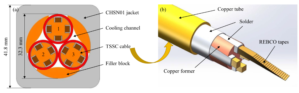 为满足下一代聚变装置(如中国聚变工程实验堆CFETR)对更强磁场、更小体积的需求,研究团队选用REBCO高温超导材料,并创新设计出“扭绞叠带开槽结构(TSSC)”电缆。该结构通过紫铜开槽骨架固定超导带材,并采用真空锡焊工艺将其固化为整体,再以高强不锈钢护套加固,有效抵抗了强磁场与大电流产生的巨大电磁力,防止了超导性能的衰减。