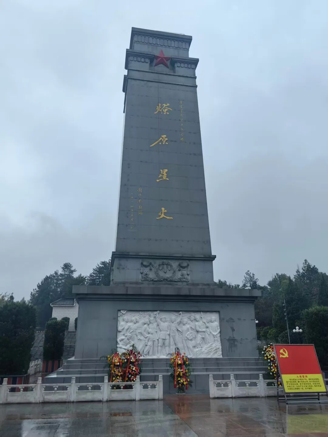 当日,金寨秋意正浓,天高云淡间透着庄严肃穆。员工队伍整齐步入红军广场,高耸的金寨县革命烈士纪念塔如利剑般直刺苍穹,塔身“燎原星火”四字在阳光下熠熠生辉,瞬间将众人思绪拉回烽火岁月。活动伊始,两名员工代表代表公司向纪念塔敬献花篮,全体人员肃立默哀一分钟,以此缅怀十万金寨儿女为革命事业奉献的壮烈一生。