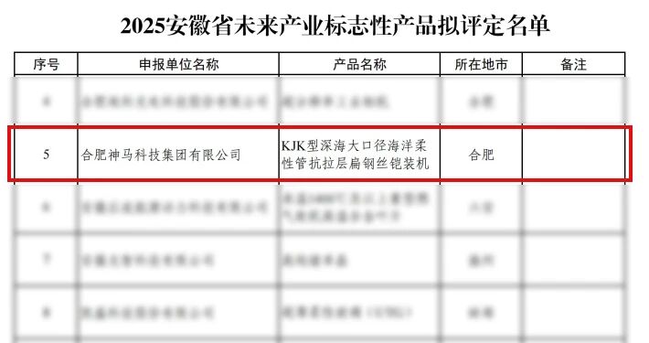 近日,安徽省工信厅、省发改委、省科技厅联合公示 2025 年安徽省未来产业标志性产品名单,合肥神马凭借在前沿技术领域的持续深耕与产业化突破,经过多轮严格评审,核心产品“KJK型深海大口径海洋柔性管抗拉层扁钢丝铠装机”成功入选 2025年安徽省未来产业标志性产品。