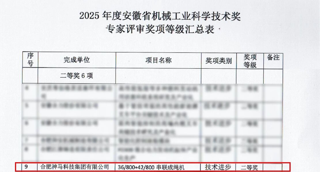 近日,2025年度安徽省机械工业科学技术奖获奖项目公示,公司自主研发的“36/800+42/800 串联成绳机”获技术进步类二等奖。该设备创新设计了Φ4200立柱行走放线机、36盘和42盘筐篮体、合绳压线瓦座(带喷油装置)、液压定径装置、液压轮水平垂直后变形器、4500双牵引装置、Φ4200立柱行走收线机、机械地轴传动系统等。解决了国内成绳机重载收卷、大长度可变退扭、大直径大扭矩等难点,可实现收放线机载重达230吨,自动实现100%±20%可变退扭、牵引钢丝直径和牵引力国内最大的特点。获授权发明专利2项,获授权实用新型专利2项。