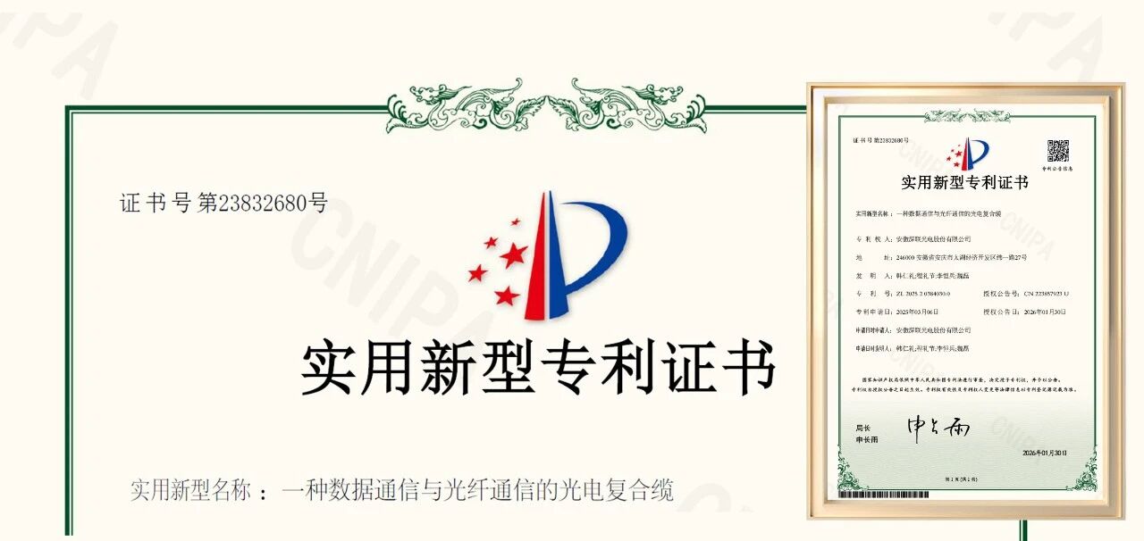 在电缆技术蓬勃发展的时代背景下,安徽深联光电股份有限公司凭借深厚的技术积淀与前瞻性创新布局,在光电复合缆领域持续深耕、稳步推进相关技术与产品发展。近日,公司自主研发的“一种数据通信与光纤通信的光电复合缆”,实现数据通信光纤通信双通道高效集成,荣获国家实用新型专利授权(专利号:ZL 2025 2 0384030.0,公告号:CN223857923 U,公告日:2026年1月30日),标志着其技术成果获得国家级认证。