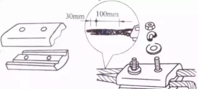 连接前,先用钢丝刷除去导线线头和沟线夹线槽内壁上的氧化层和污物,涂上凡士林锌膏粉(或中性凡士林),然后将导线线卡入线槽,旋紧螺栓,使沟线夹紧紧夹住线头而完成连接。为防止螺栓松动,压紧螺栓上应套以弹簧垫圈。