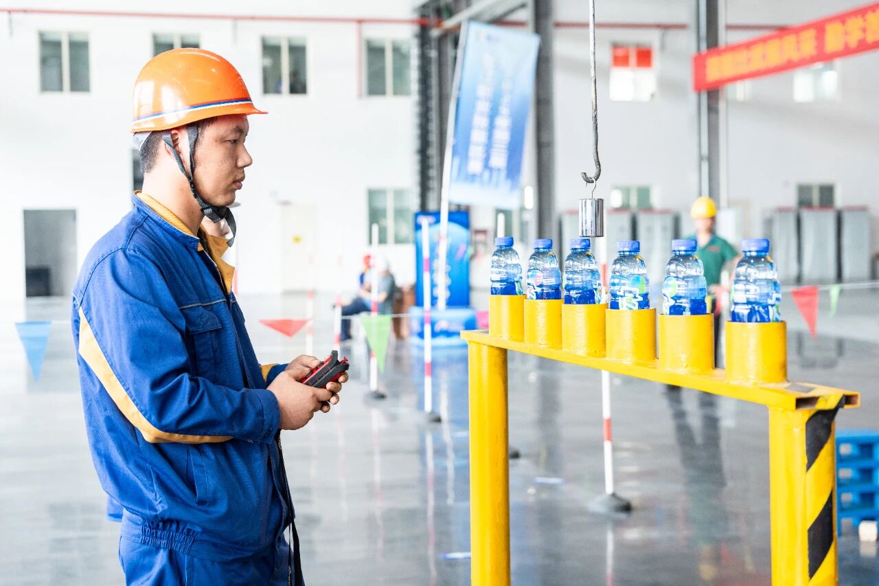 比赛现场,选手们纷纷大显身手,展示精湛技艺。叉车组的选手们灵活操作叉车,叉动钢针叠放螺母;行车组的选手们通过行车将砝码精准放在脉动瓶上;焊工组的选手们采用蹲姿90度仰焊,展现了卓越的焊接技艺;电工组的选手们则通过组装自动化电气元件,展现了出色的电工技能。