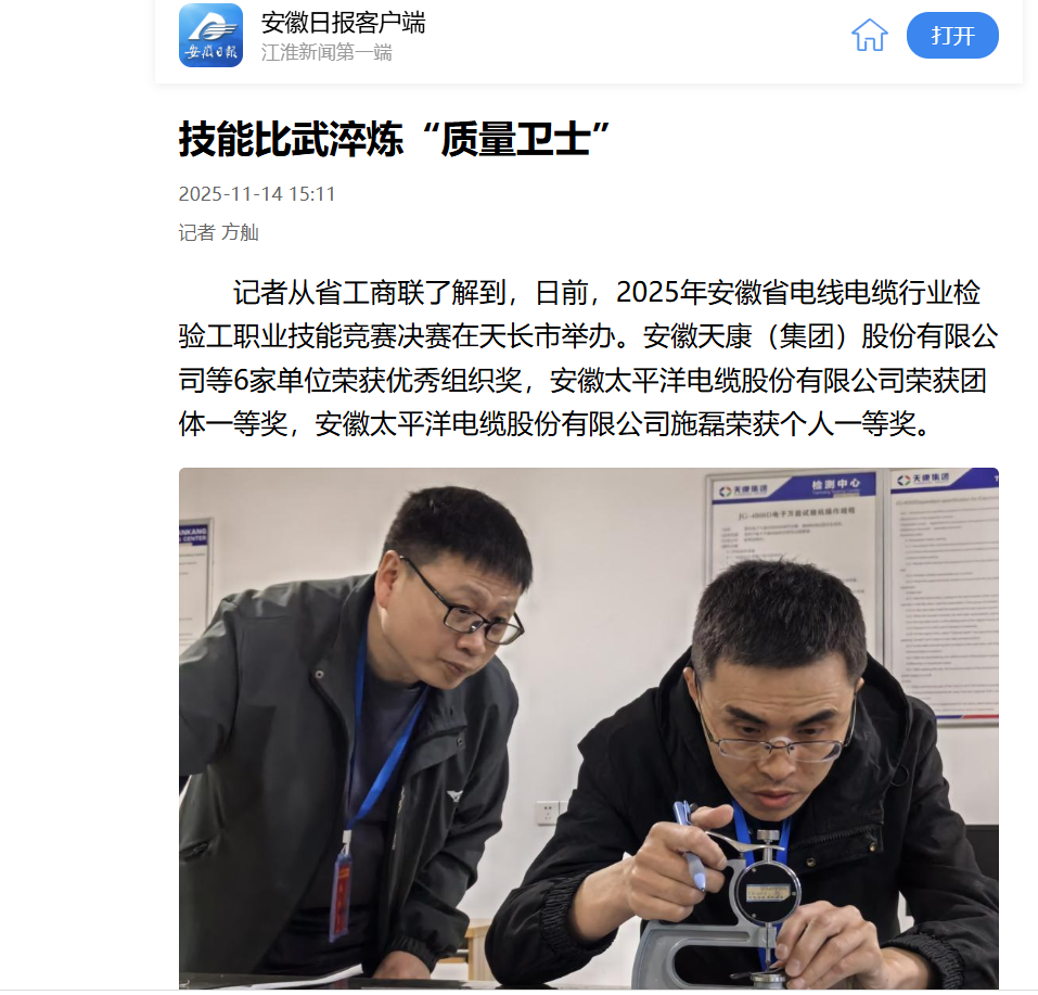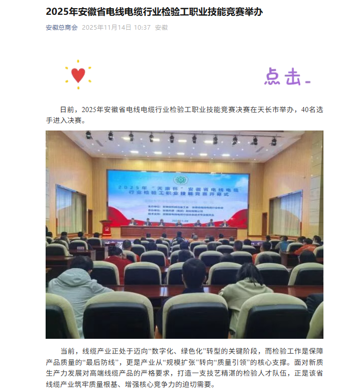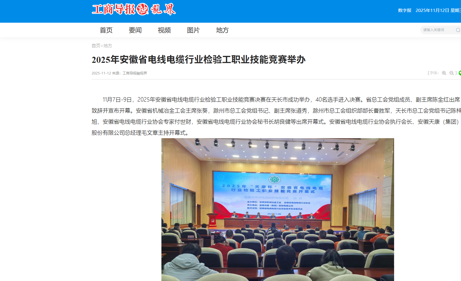 中国新闻网、安徽日报等国家和省级重量级媒体对2025年安徽省电线电缆行业检验工职业技能竞赛给予报道