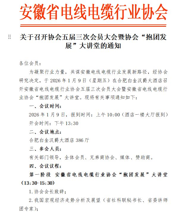 【通知】关于征集“安徽省电线电缆行业协会五届三次会员大会暨第四届安徽电线电缆产业大会”赞助企业的通知