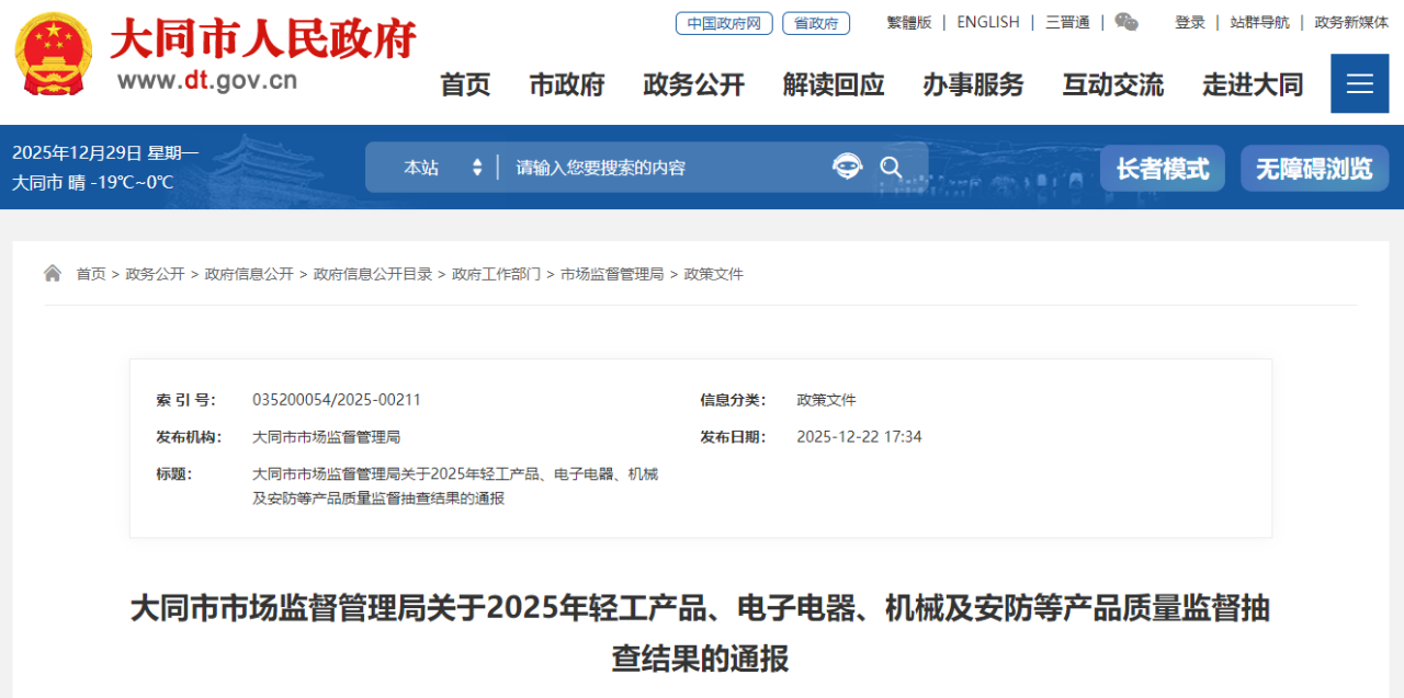 为深入贯彻落实《山西省人民政府关于全面推进质量强省建设的实施意见》要求,不断加强对关系人民群众身体健康和生命财产安全、公共安全、生态环境安全的重点产品质量安全监管,按照《2025年全市产品质量安全监管工作要点》、《2025年全市重点工业产品质量安全监管目录》等文件精神要求,根据产品质量监督抽查计划安排,大同市市场监督管理局对电线电缆等相关产品5大类27种产品开展了产品质量监督抽查。本次共抽查了157家经销企业、1家生产企业的219批次产品(详见附件)。发现不合格产品34批次,综合不合格发现率15.52%。