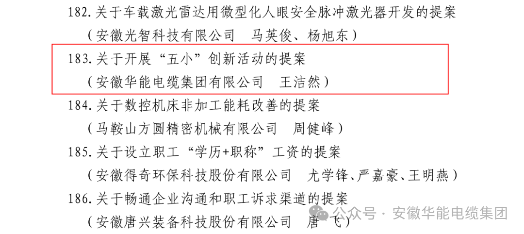 近日,全国厂务公开协调小组办公室公布 2023—2025 年度 “聚合力 促发展” 全国职工代表优秀提案名单。安徽华能电缆集团王洁然提交的《关于开展 “五小” 创新活动的提案》成功入选,为安徽省优秀提案之一。本次征集聚焦制度完善、技术创新、管理优化、职工权益等领域,经严格评审后确定结果。
