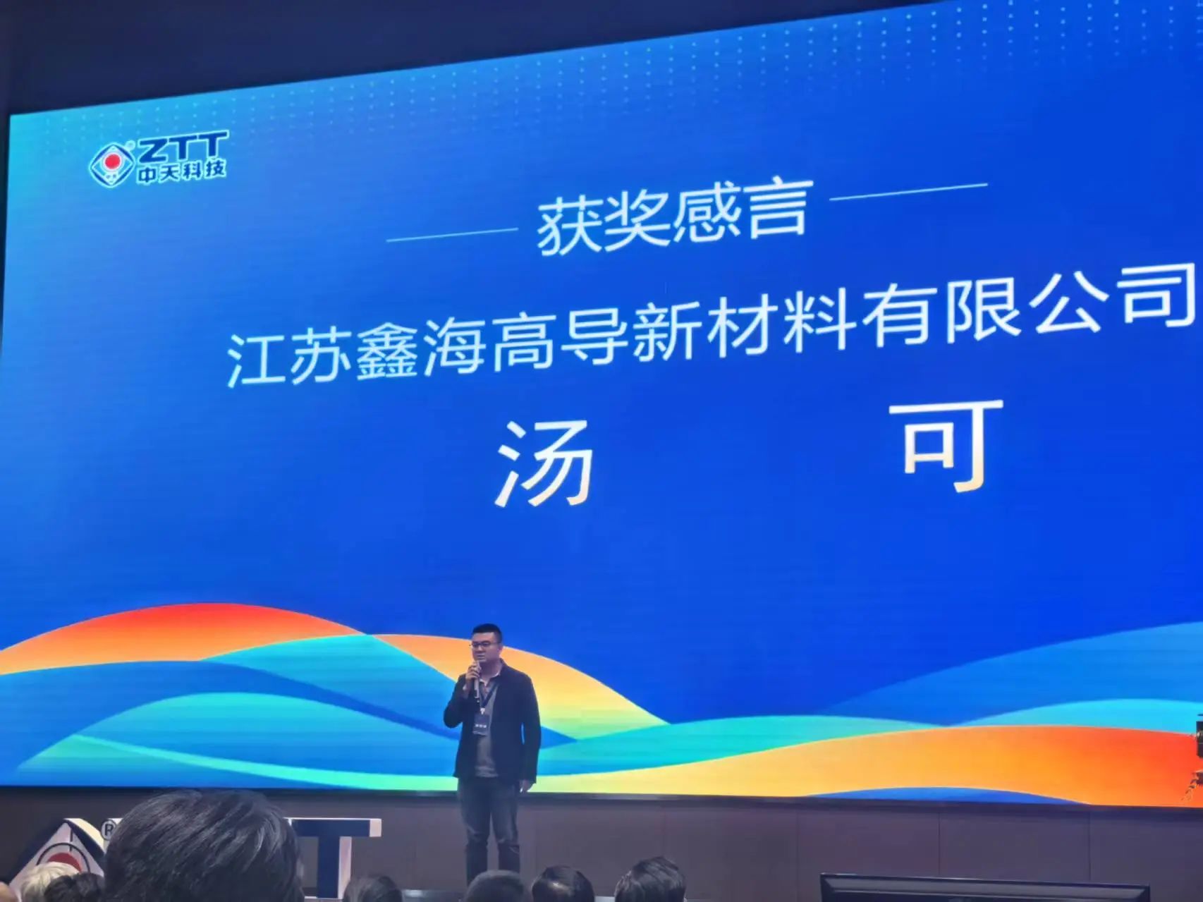 本次大会活动上 江苏鑫海高导新材料有限公司 凭借卓越的 铜导体产品 在品质领先的技术实力及稳定的供应能力,从全球供应商中脱颖而出,获颁 “中天科技战略合作伙伴 ”。这一荣誉是中天科技对鑫海高导的高度认可。标志着双方将持续在 特种导体、高端装备电缆、海缆、中高压电缆、新能源光伏等领域展开深度 铜铝导体 协同合作,共同打造 “技术共研、产能共拓、生态共建” 的战略合作伙伴关系。江苏鑫海高导新材料有限公司销售总监汤可代表公司领奖并发表战略合作伙伴感言。