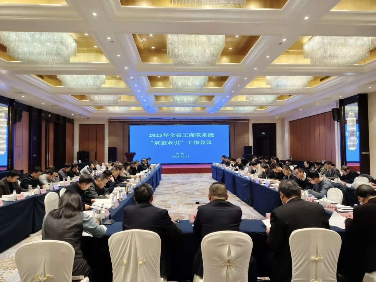 12月11日至12日,2025年全省工商联系统“双招双引”工作会议在合肥召开。省工商联副主席聂磊、安徽国有金融资本投资管理有限公司董事长潘友华出席会议并讲话,省新兴产业推进组、省发展改革委等相关部门负责同志,各市工商联负责人及省联直属商会代表共80余人参会。