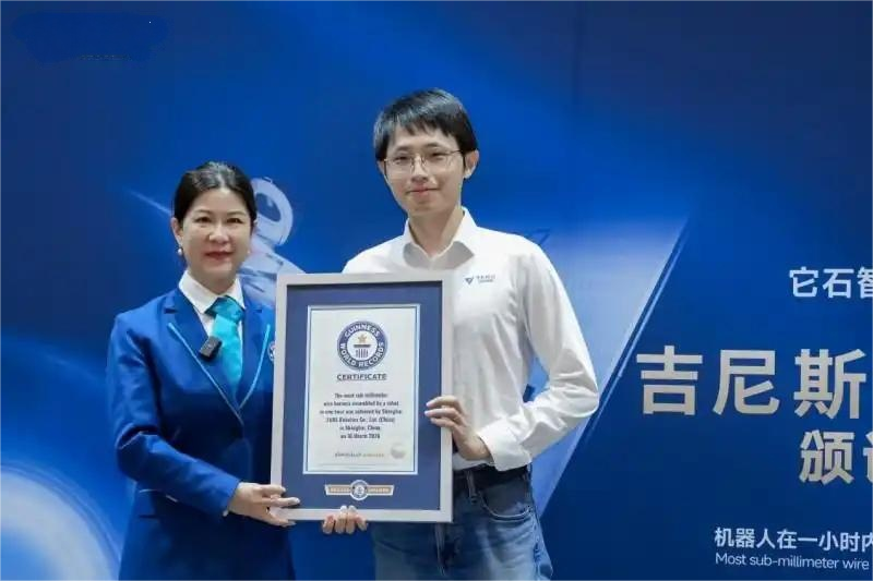 这是中国具身智能企业在工业精密操作领域的首次吉尼斯世界纪录挑战,标志着它石机器人在工业应用场景中展现出强大的落地能力。它石首席科学家丁文超博士在AWE展台,代表它石接受吉尼斯世界纪录官方认证官所颁发的证书。