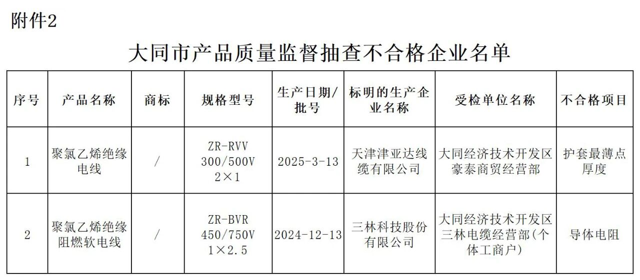 为深入贯彻落实《山西省人民政府关于全面推进质量强省建设的实施意见》要求,不断加强对关系人民群众身体健康和生命财产安全、公共安全、生态环境安全的重点产品质量安全监管,按照《2025年全市产品质量安全监管工作要点》、《2025年全市重点工业产品质量安全监管目录》等文件精神要求,根据产品质量监督抽查计划安排,大同市市场监督管理局对电线电缆等相关产品5大类27种产品开展了产品质量监督抽查。本次共抽查了157家经销企业、1家生产企业的219批次产品(详见附件)。发现不合格产品34批次,综合不合格发现率15.52%。