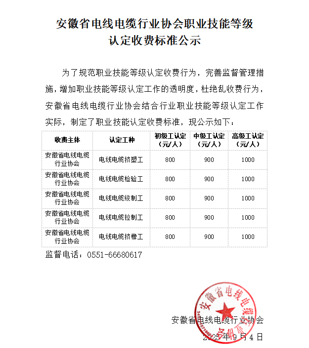 【公示】安徽省电线电缆行业协会职业技能等级认定收费标准公示