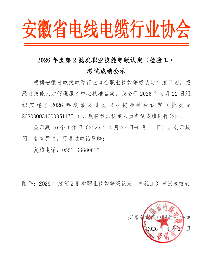 【公示】2026年度总第2批次职业技能等级认定(检验工)考试成绩公示