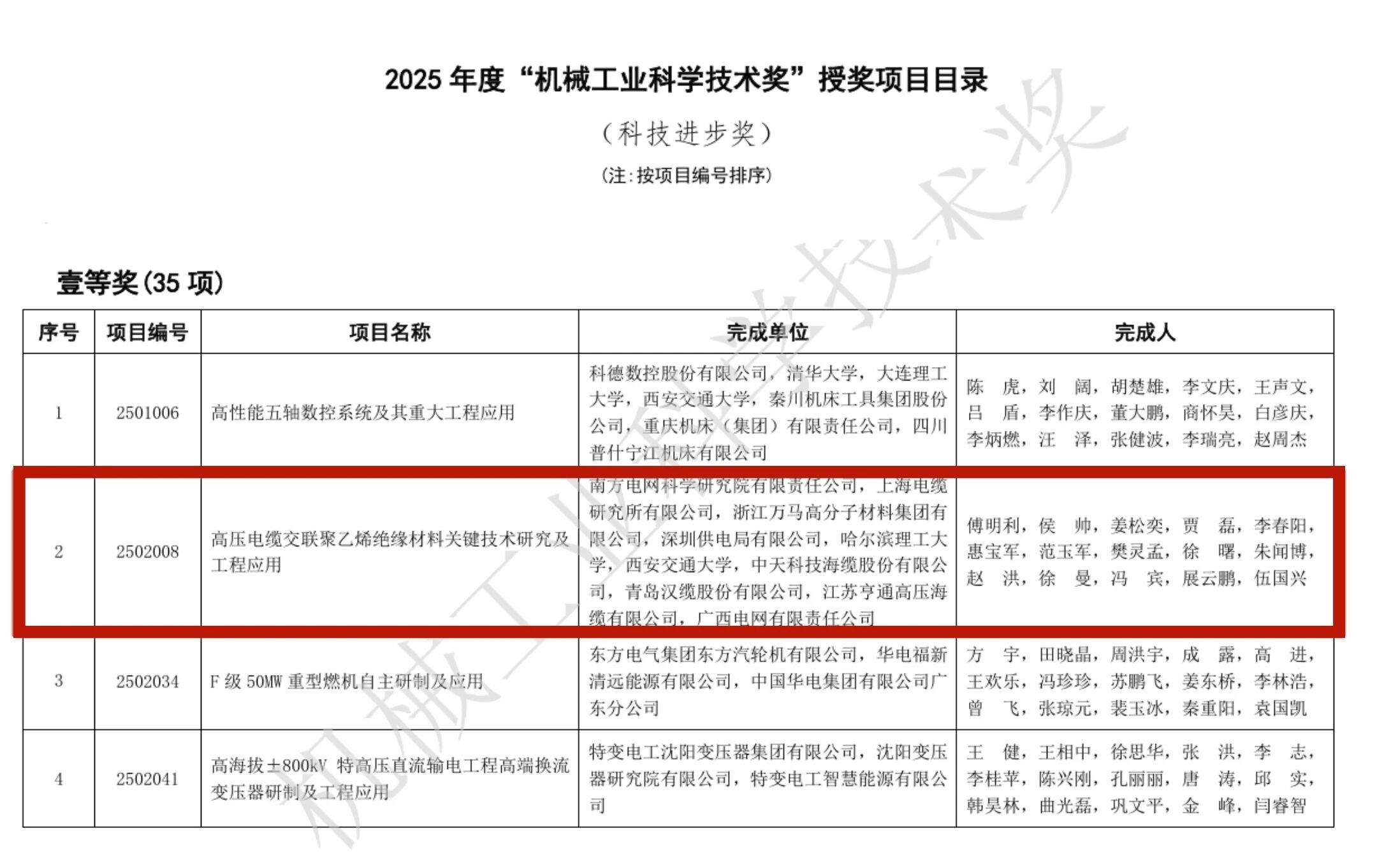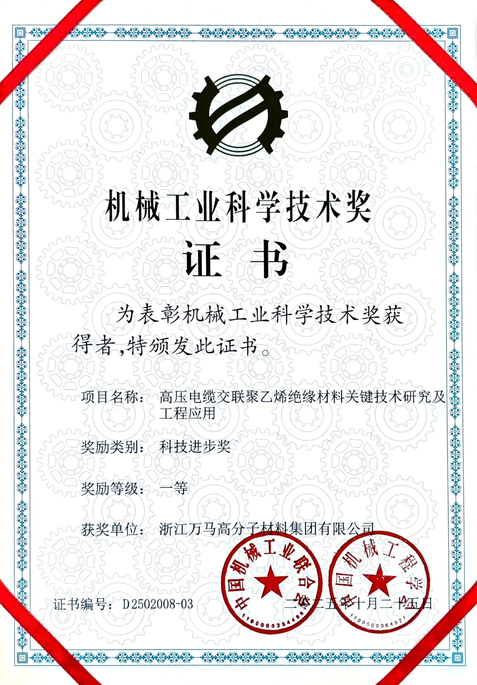 近日,中国机械工业联合会公布了《2025年度“机械工业科学技术奖”授奖目录》,万马高分子参与的“高压电缆交联聚乙烯绝缘材料关键技术研究及工程应用”项目荣获2025年度“机械工业科学技术奖”科技进步一等奖。