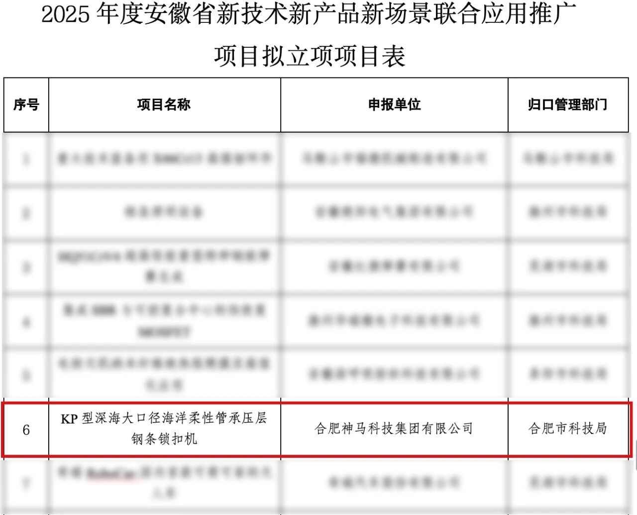 近日,安徽省科技厅正式公示2025年度安徽省新技术新产品新场景联合应用推广项目立项名单,公司自主研发的“KP型深海大口径海洋柔性管承压层钢条锁扣机”凭借核心技术突破与广泛应用价值,成功入选该名录,彰显了公司在海洋工程装备领域的硬核创新实力。