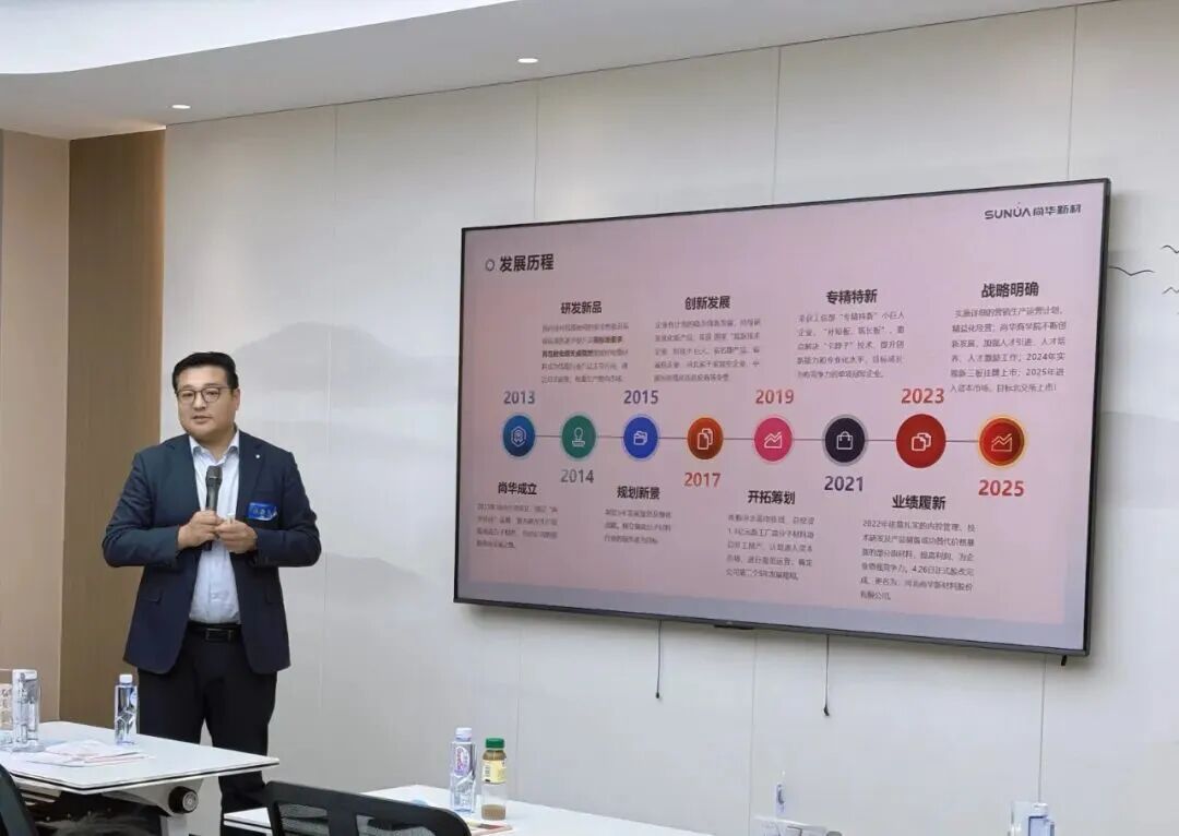 交流座谈环节,董事长杜敬亮围绕企业发展战略与产业全景作主题分享,重点从核心技术研发与产品体系构建、智能制造升级布局、多元行业应用场景拓展及未来发展规划等方面进行系统阐述。他表示,尚华新材自成立以来,始终将科技创新置于核心地位,深耕特种高分子新材料领域,致力于为全球客户提供高性能、绿色可持续的材料解决方案;未来,公司将持续推进产业链上下游协同发展,加速绿色低碳转型进程,期待与广大青年企业家深化交流合作,凝聚发展合力,共推行业高质量发展。
