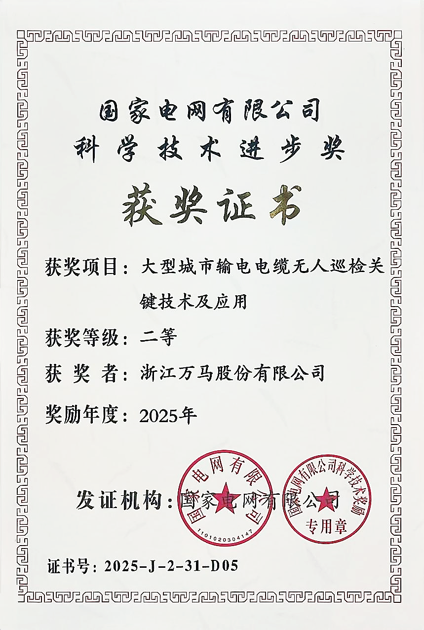 辞旧迎新启新程,凝心聚力传捷报!马年伊始,公司迎来振奋喜讯,万马股份参研的 “大型城市输电电缆无人巡检关键技术及应用” 项目,荣获国家电网有限公司科学技术进步奖二等奖!