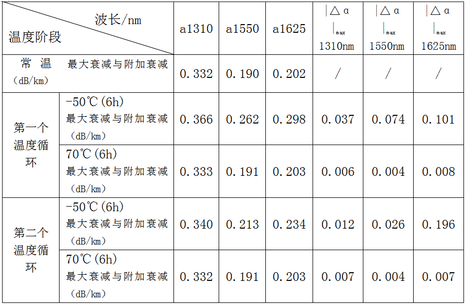 随着应用场景的不断扩展,对当今微缆的使用环境提出了更高的要求,微缆逐渐在-50℃以下的低温环境下运用。为探究该全干式气吹微缆的耐低温性能,补充该光缆在-50℃的温度循环试验,数据对比见下表。