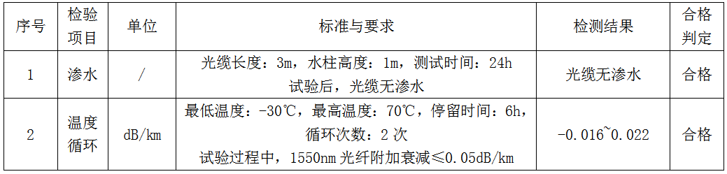 根据标准YD/T 1460.4-2019《通信用气吹微型光缆及光纤单元 第4部分:微型光缆》对成品光缆进行环境性能的测试,结果见下表,试验结果合格,符合标准要求。