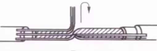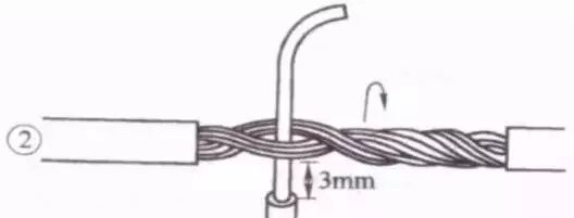 接着把这两股芯线按顺时针方向紧缠2圈后,再折回90° 并平卧在折起前的轴线位置上。