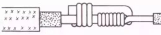 把细导线线头在粗导线线头上紧密缠绕5~6圈,弯折粗线头端部,使它压在缠绕层上,再把细线头缠绕3~4圈,剪去余端,钳平切口。