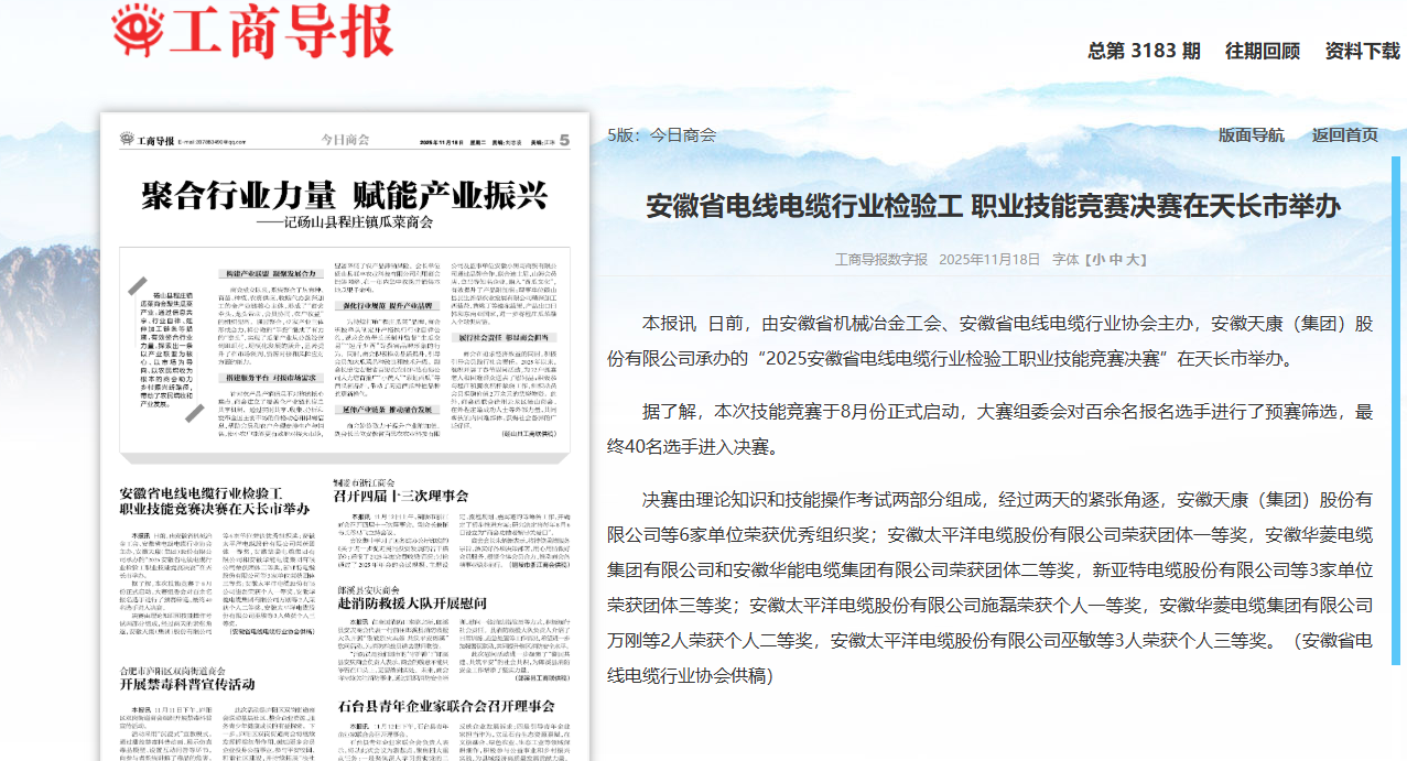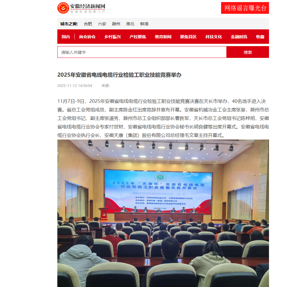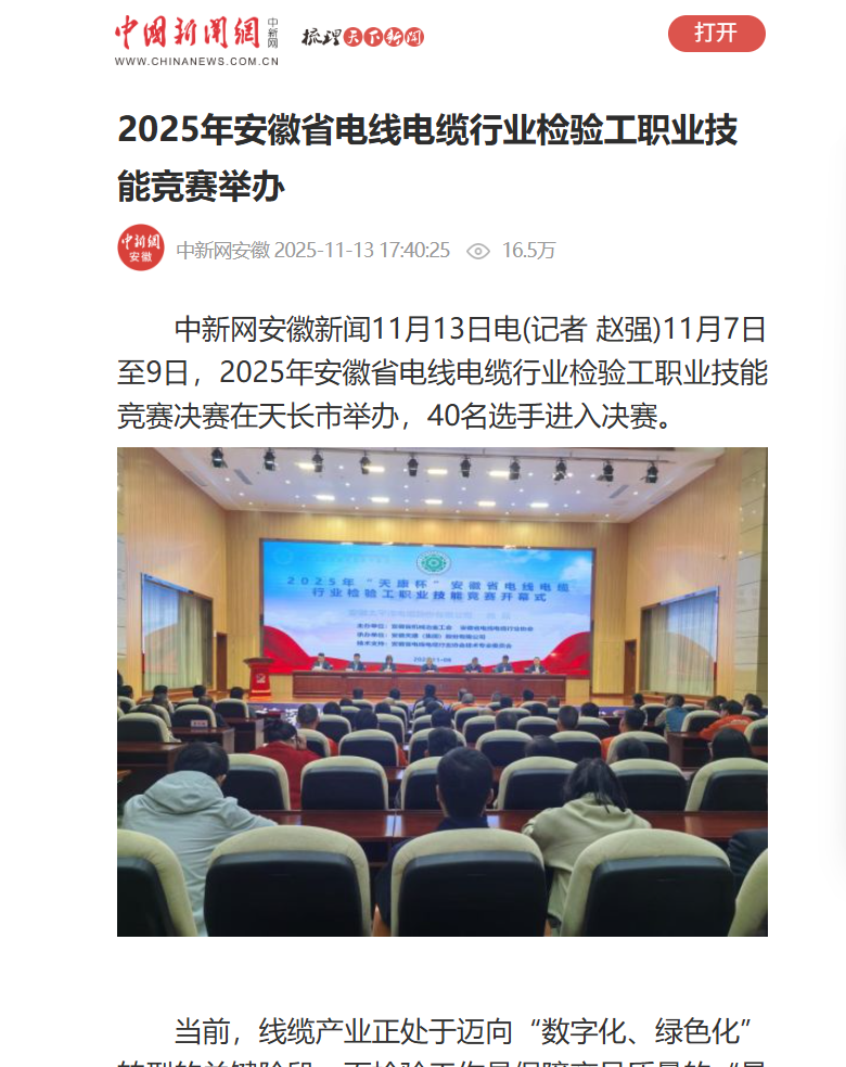 中国新闻网、安徽日报等国家和省级重量级媒体对2025年安徽省电线电缆行业检验工职业技能竞赛给予报道
